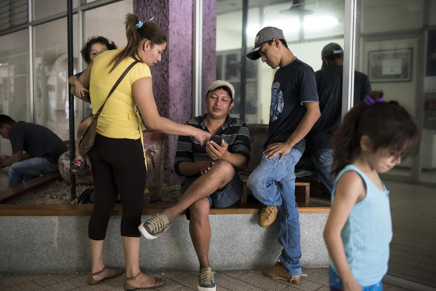 Danilo and two other asylum seekers sit and sit outside the offices where they are waiting to hear about the status of their applications. The woman on the left attended cosmetology school and is showing Danilo and his friend, Nildeson Ismael, photos from school. Danilo dreams of attending cosmetology school when he makes it to Tijuana.