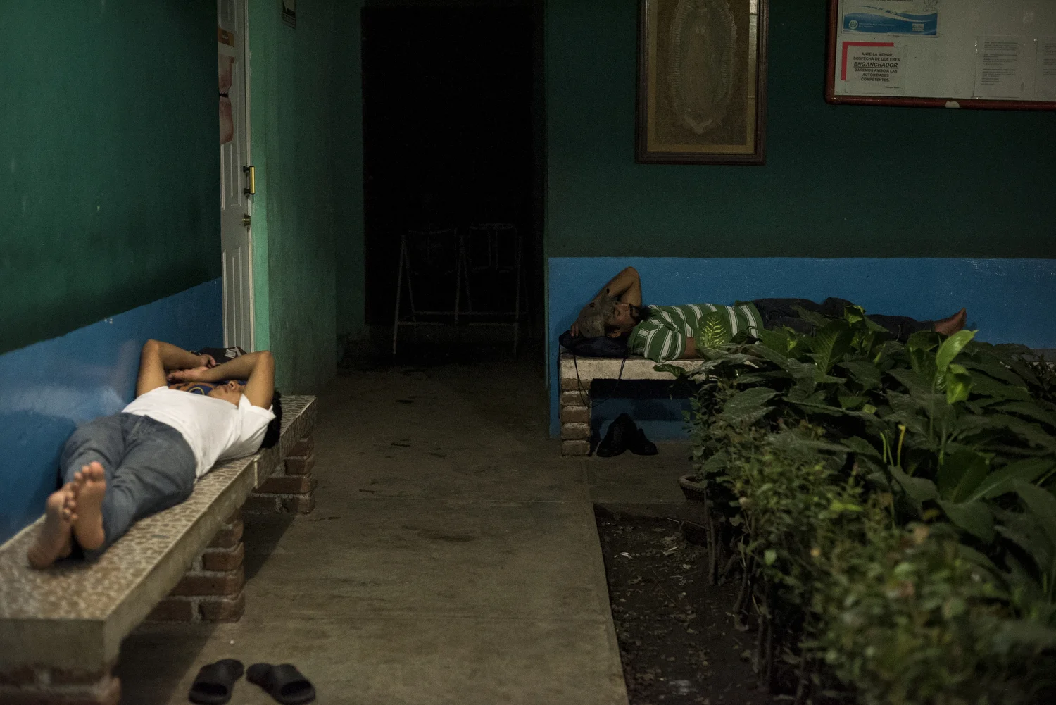 Tapachula is the primary entry point for Central Americans making their way north and shelter space is extremely limited. Here, migrants sleep on benches in the shelter's courtyard.