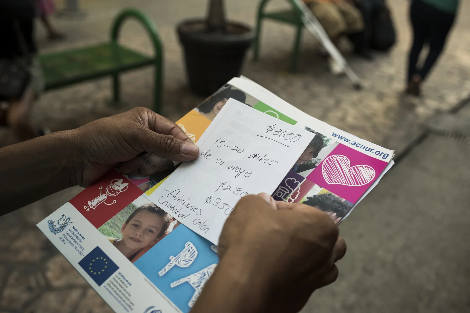 Prices for various travel options from Tapachula to Tijuana written on a piece of paper. Danilo was hoping to hear if his asylum application had been accepted and was seeing how much a plane or bus ticket would cost him to get to Tijuana. But they're expensive and he doesn't know how he'll be able to afford either of the alternatives.