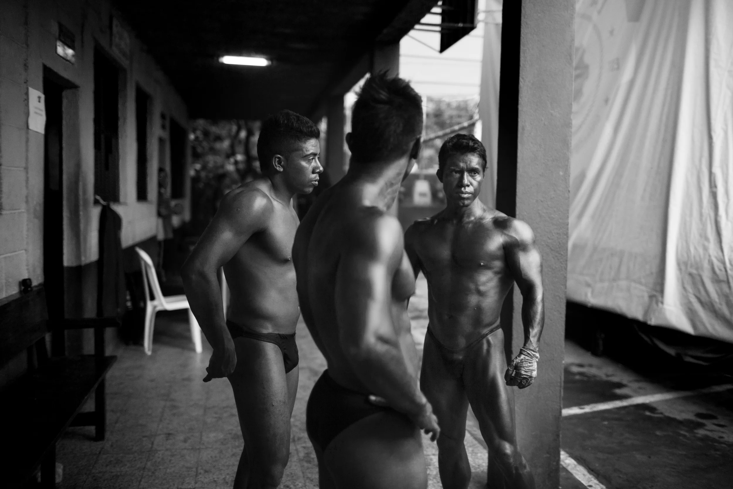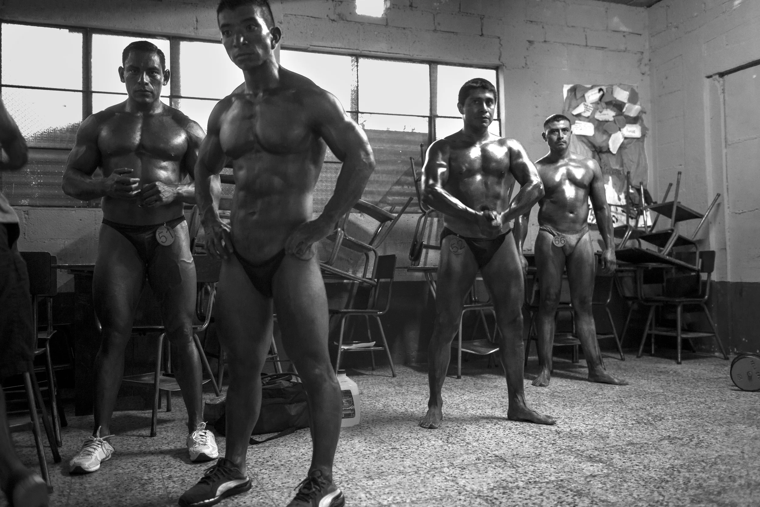 Competitors before the Gimnasio La Fábrica bodybuilding contest in Antigua, Guatemala.