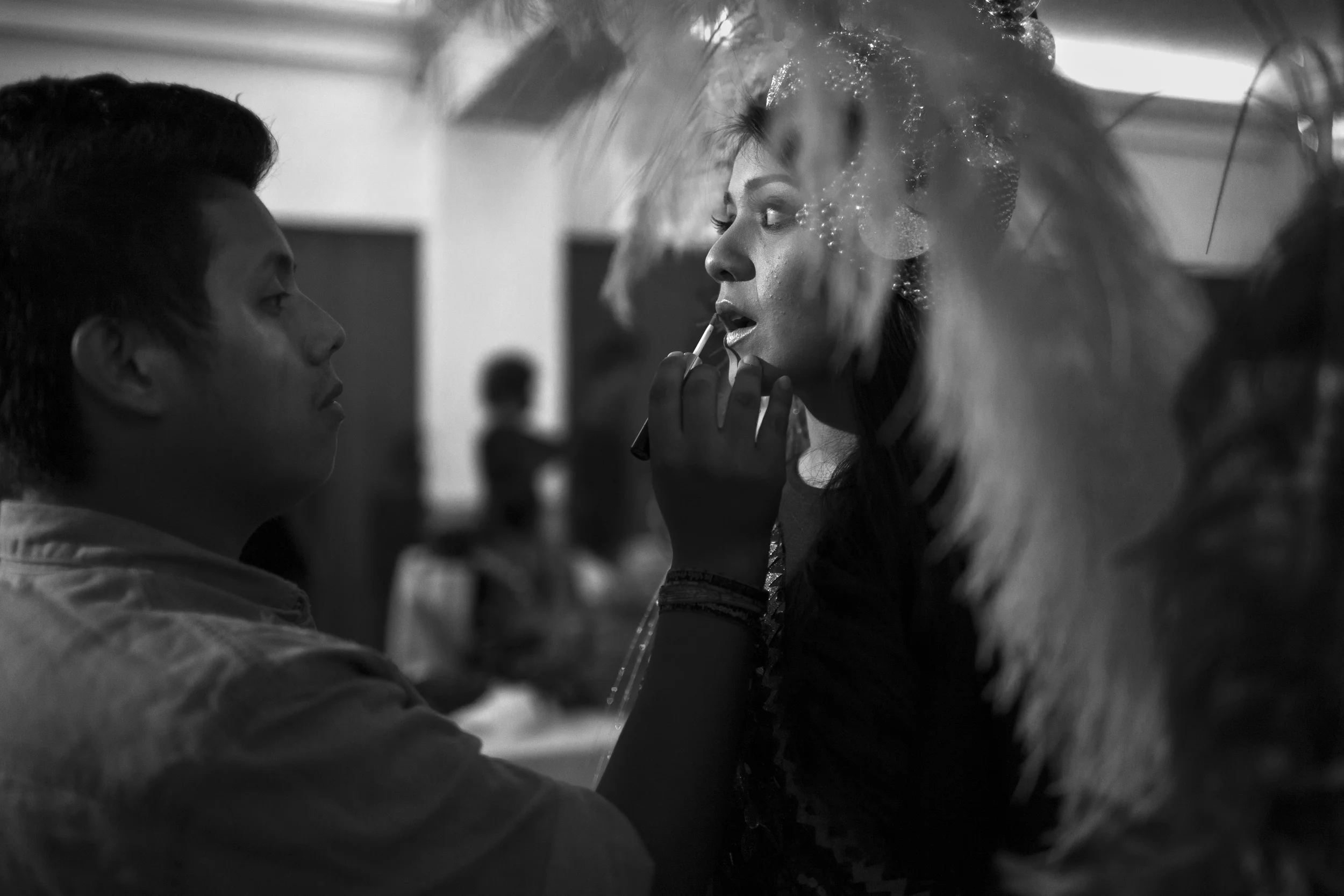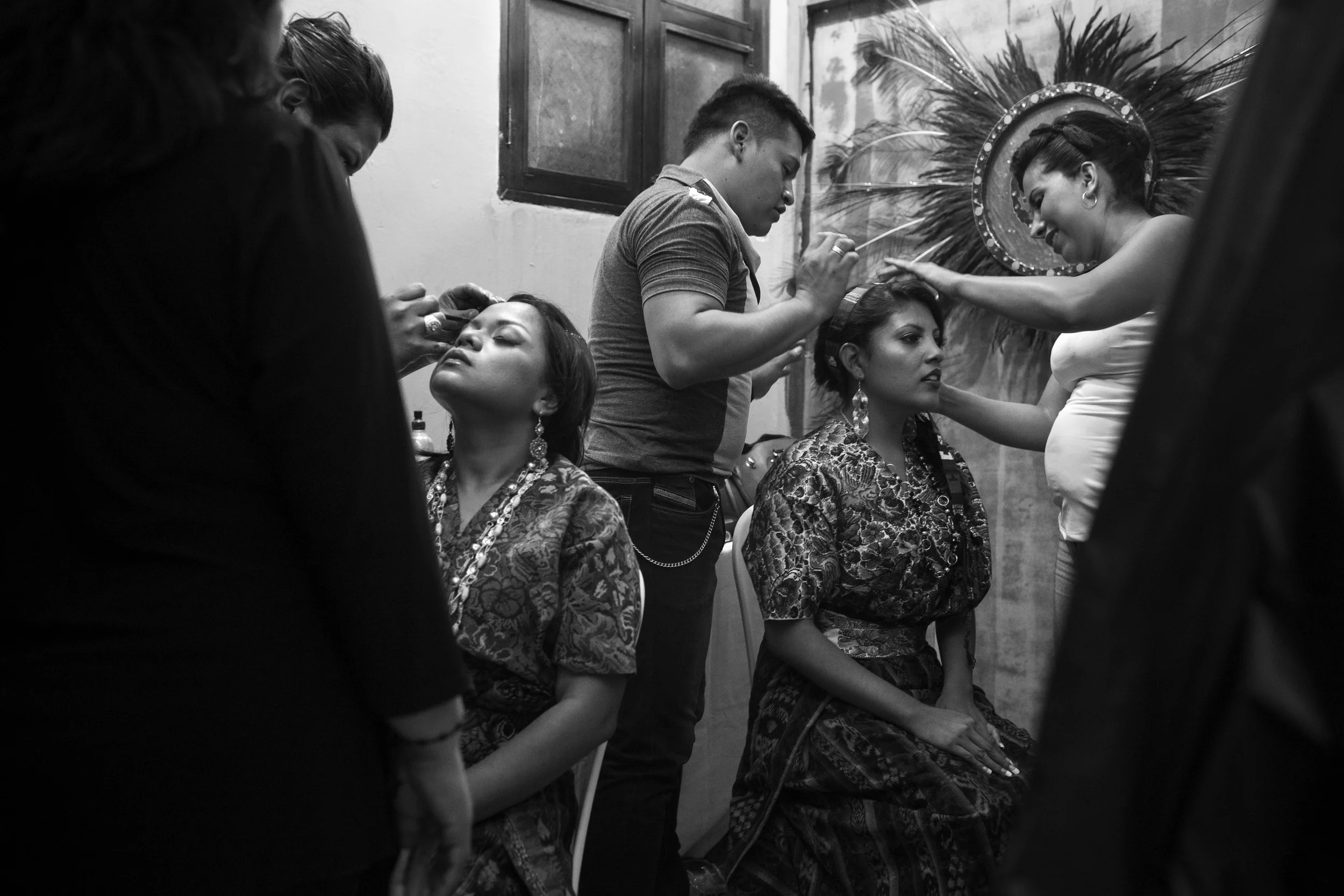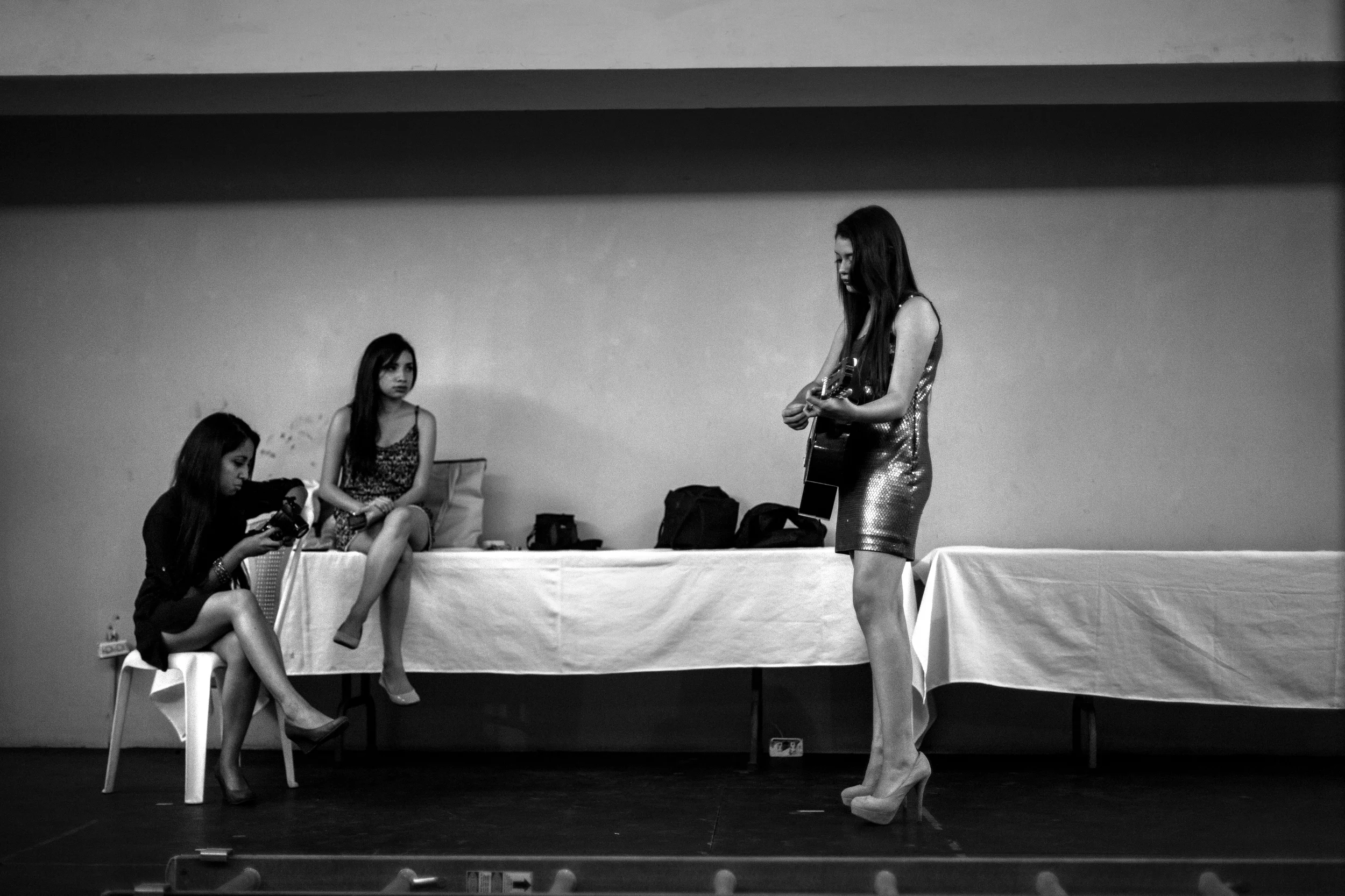 Rehearsing backstage for the 2014 Miss Antigua beauty pageant. Antigua, Guatemala.