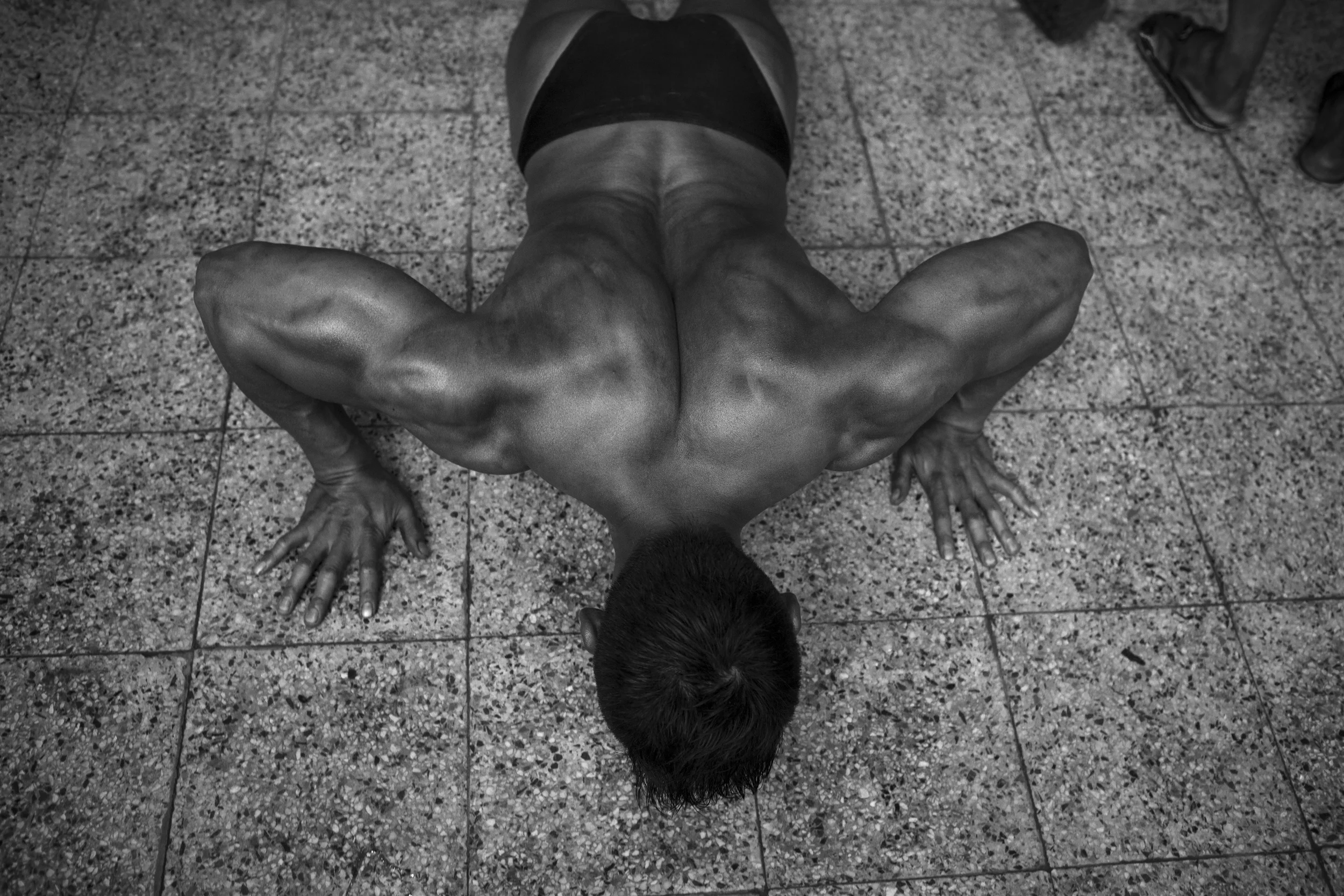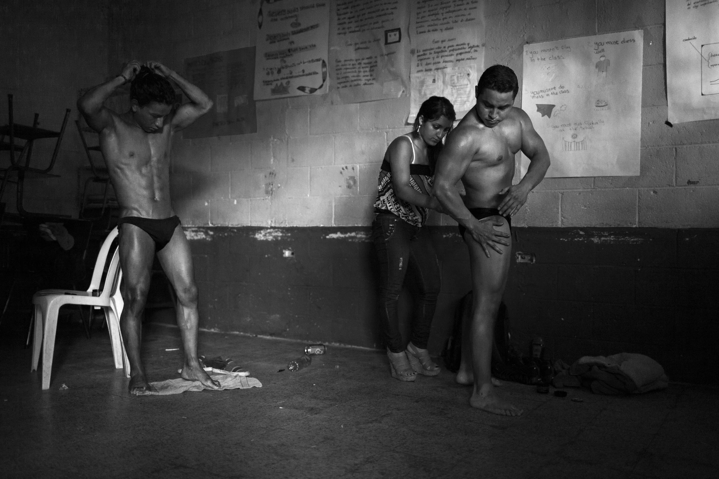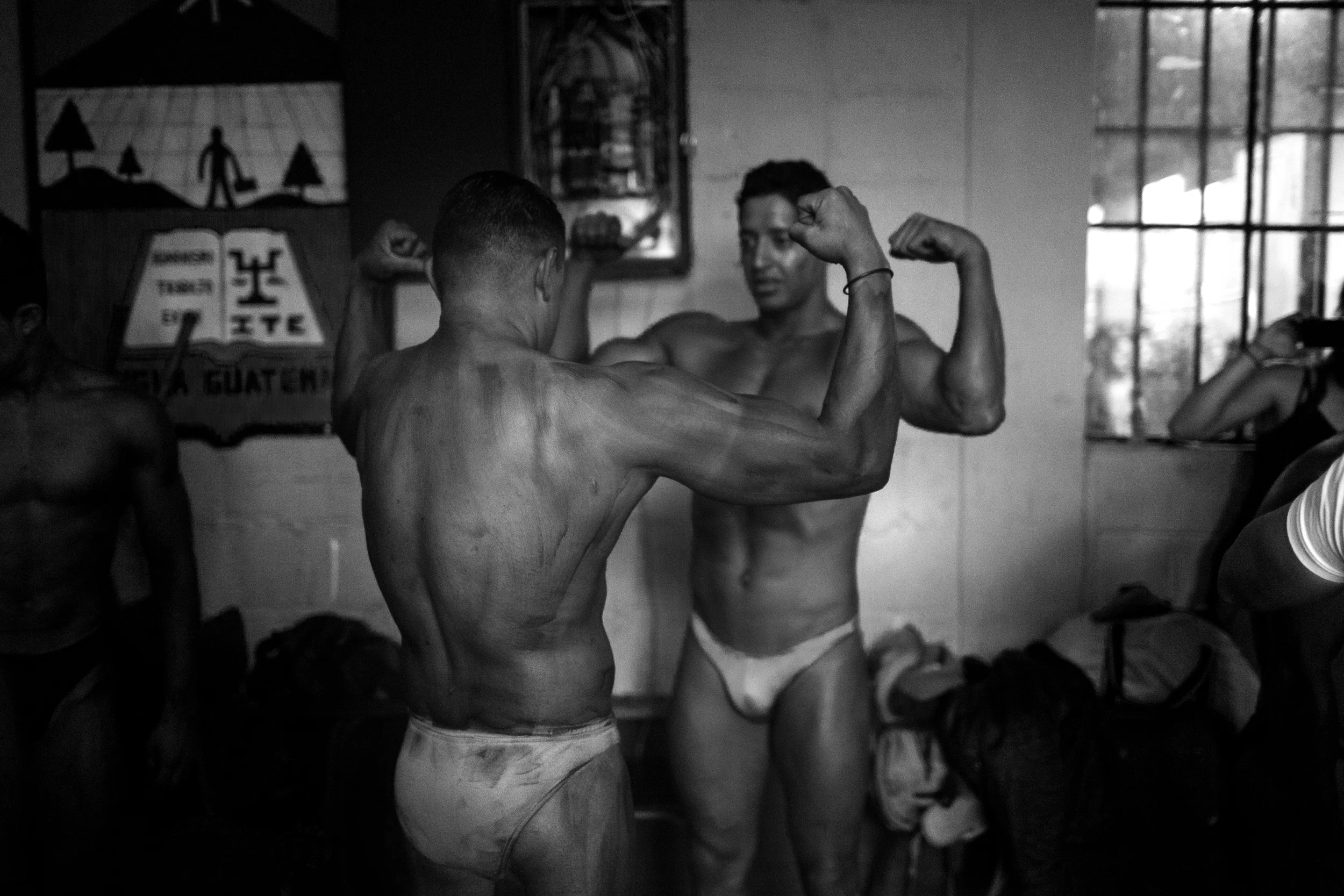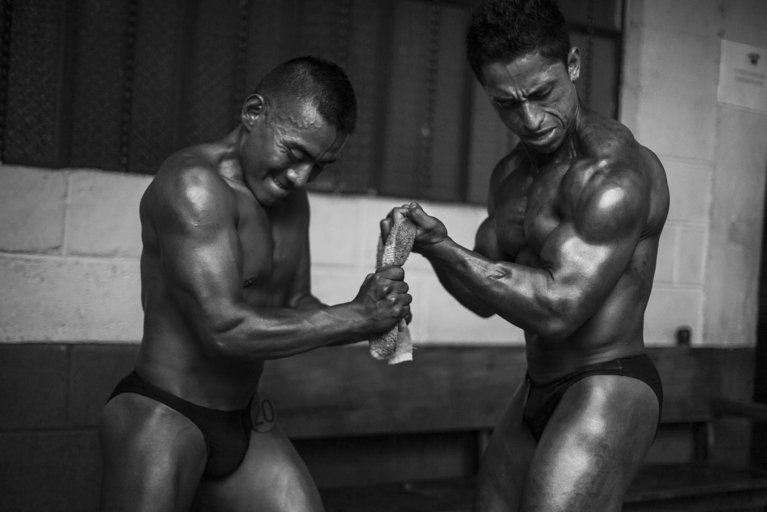 Competitors look for a pre-contest pump before the Gimnasio La Fábrica bodybuilding contest in Antigua, Guatemala.