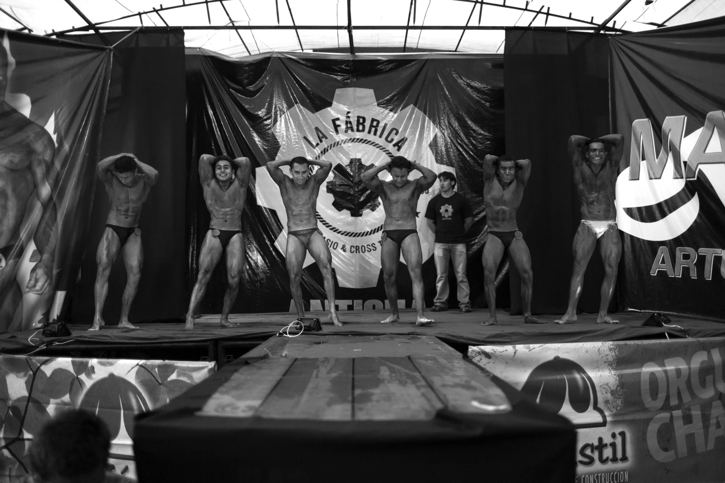Competitors on stage at the the Gimnasio La Fábrica bodybuilding contest in Antigua, Guatemala.