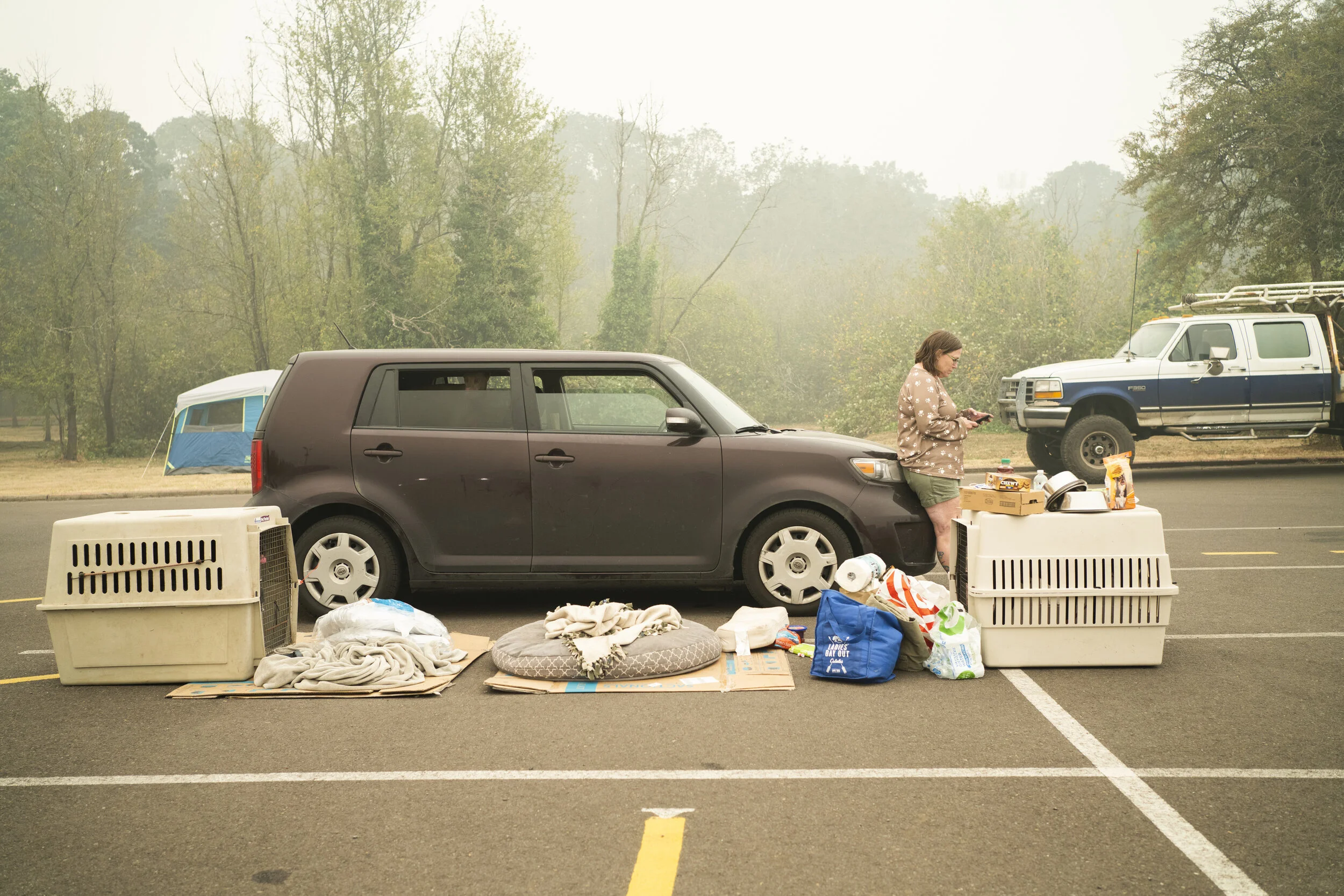 Evacuees from nearby areas sit in front of Bridgette Noce’s pastures on Sept. 9 2020 in Canby, Oregon. Noce took in people and animals during the fires.
