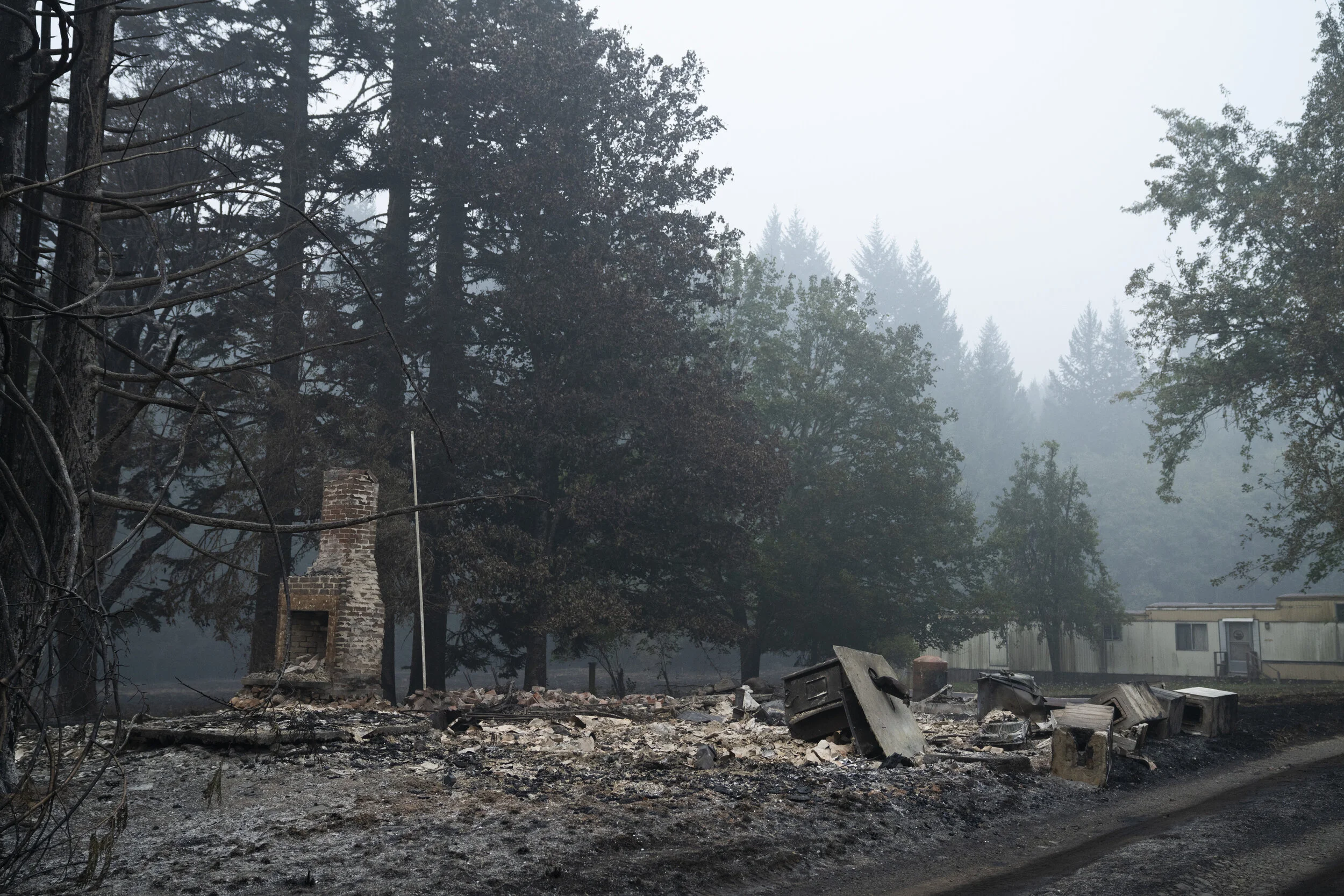 A burned house near the Riverside fire on September 14, 2020 in Estacada, Oregon. Some residents chose to return to their homes as favorable weather helped slow the fire’s spread.