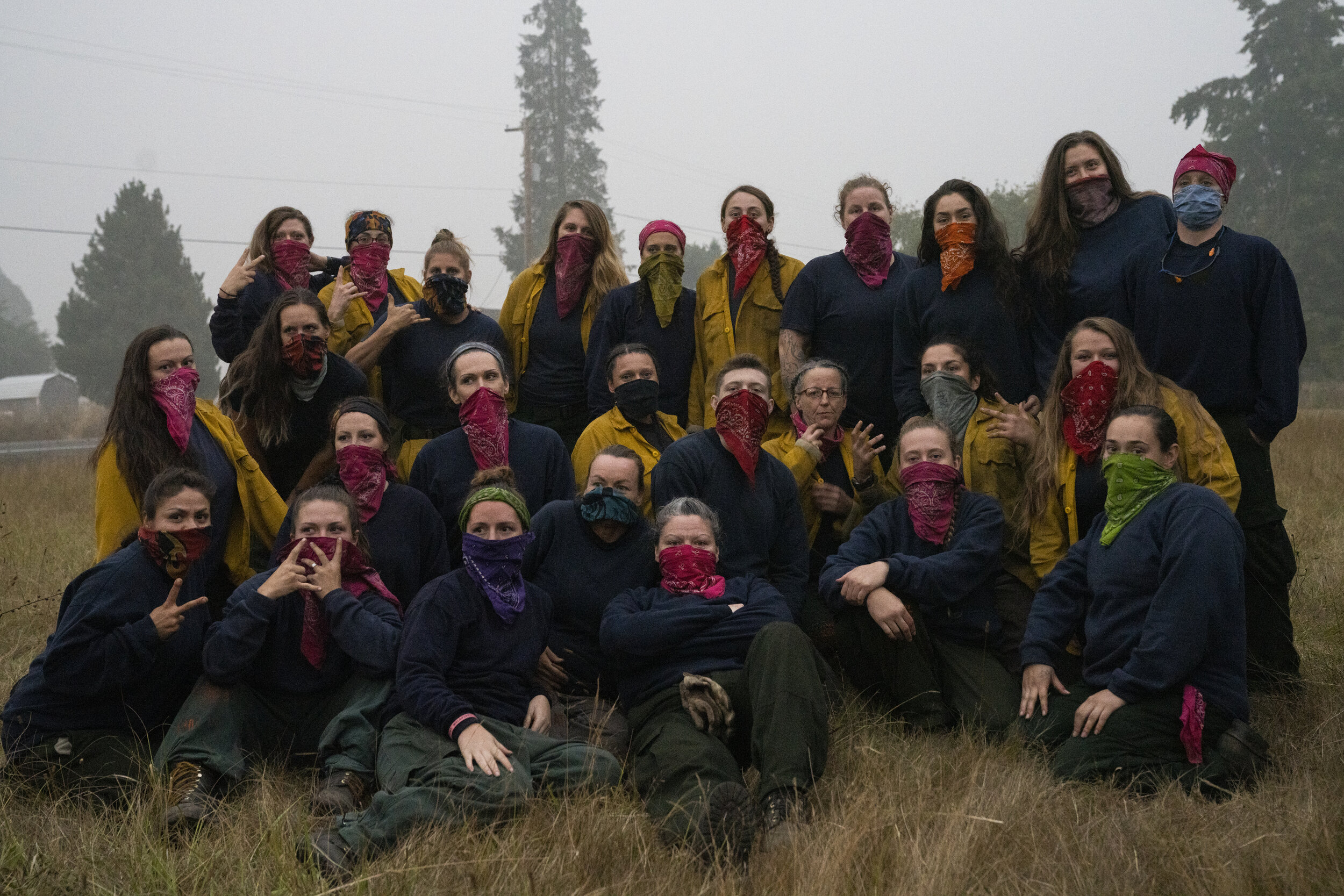 Inmate firefighters from Coffee Creek Correctional Facility sit for a photo after coming off the Riverside fire lines on September 14, 2020 in Logan, Oregon.