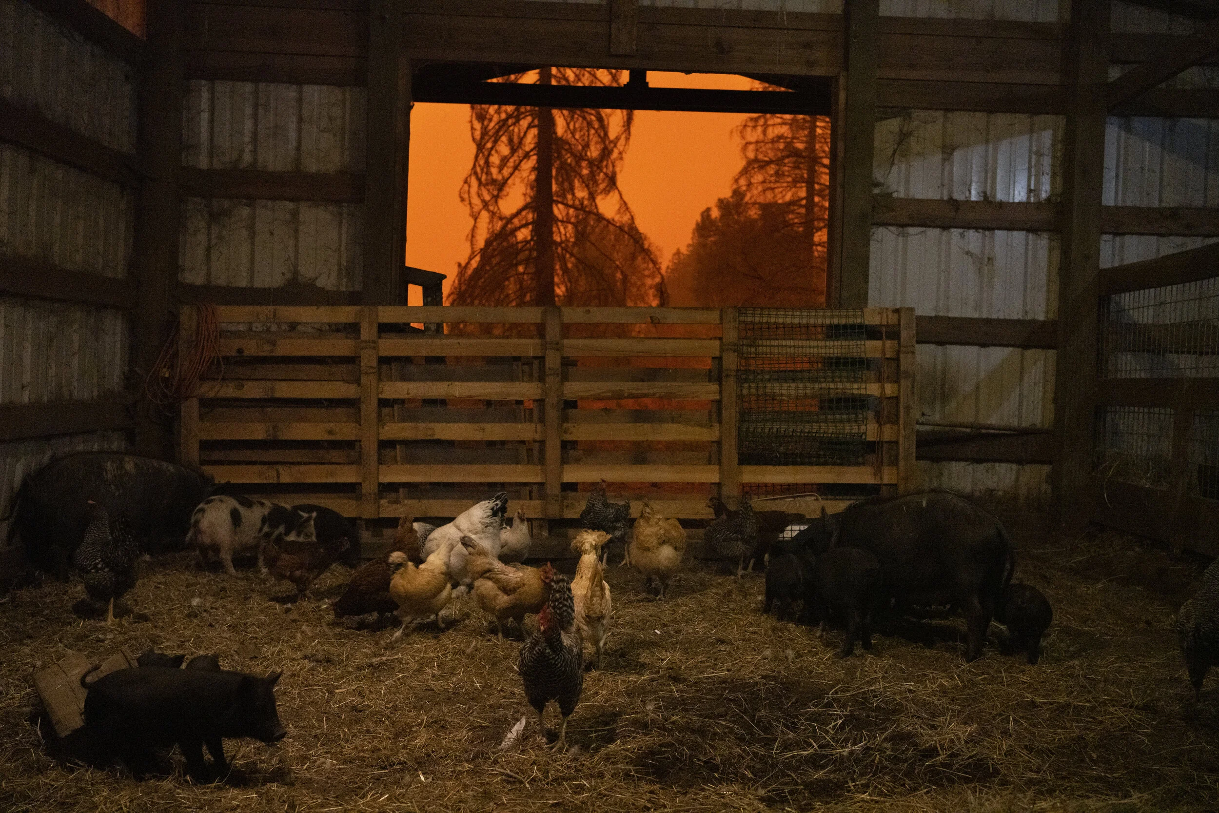 Some of Bridgette Noce’s animals wait for her to feed them as wildfires burn nearby on Sept. 9 2020 in Canby, Oregon.