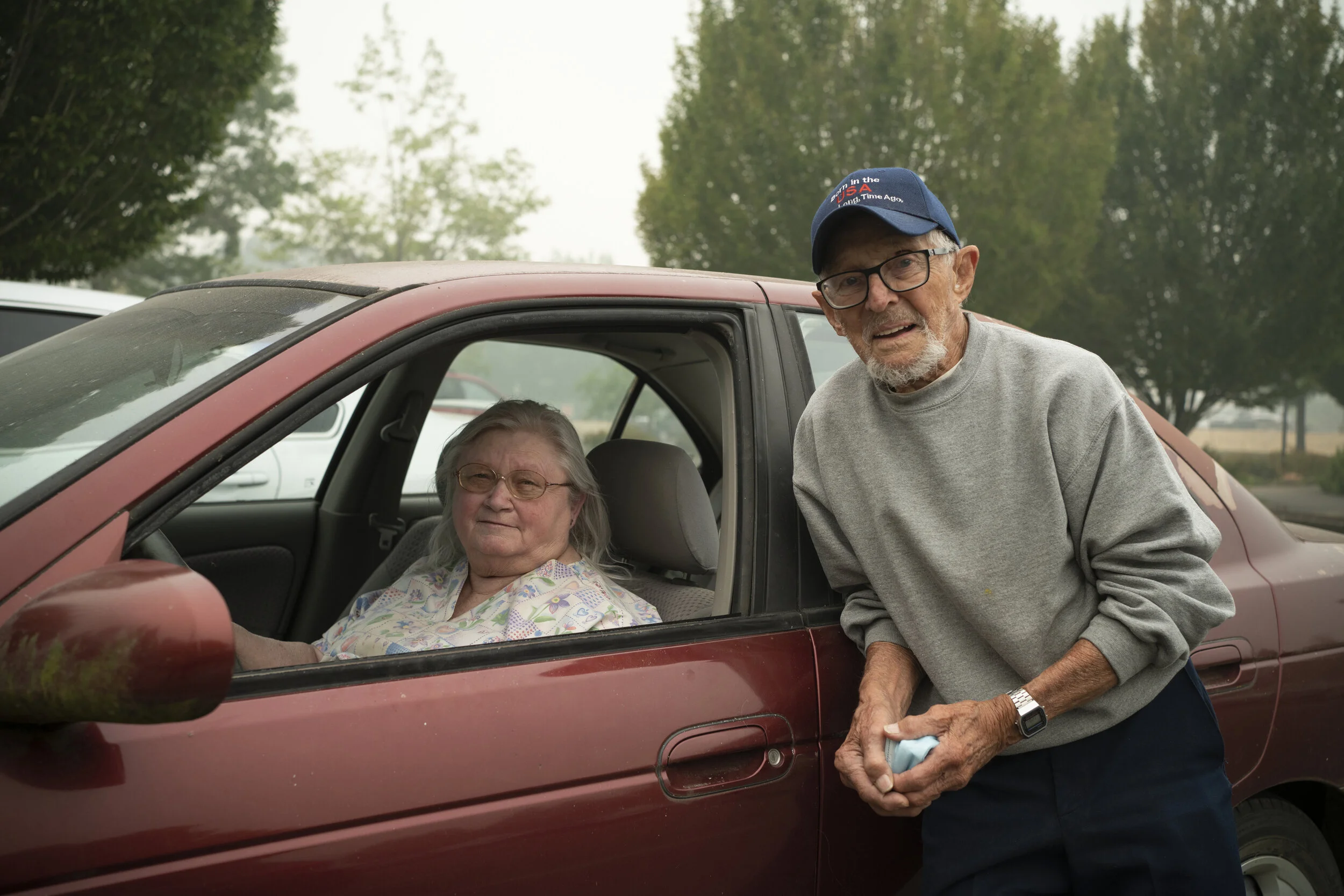 Nancy Price and her husband Dave Silverberg, together in a parking lot shelter in Clackamas County, Oregon on September 10, 2020. The couple had to evacuate with no warning and didn’t have time to pack any of their belongings, clothes or medication.
