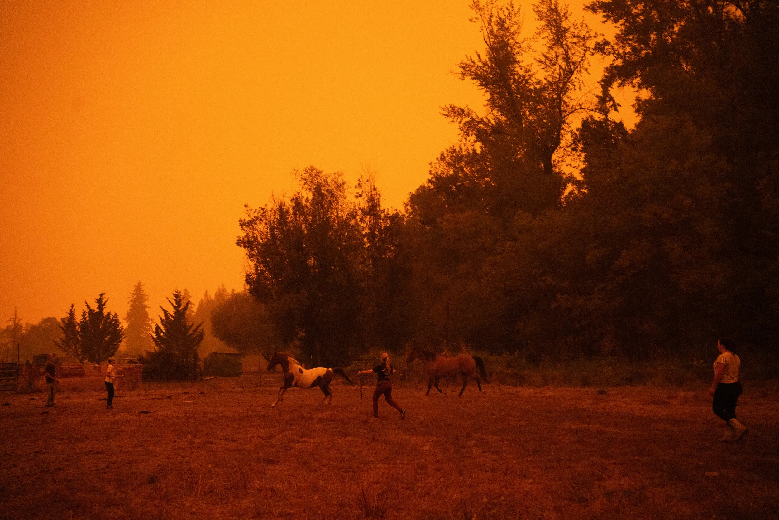 Chance Johnson corrals horses to be evacuated from the path of nearby fires on Sept. 9 2020 in Canby, Oregon.