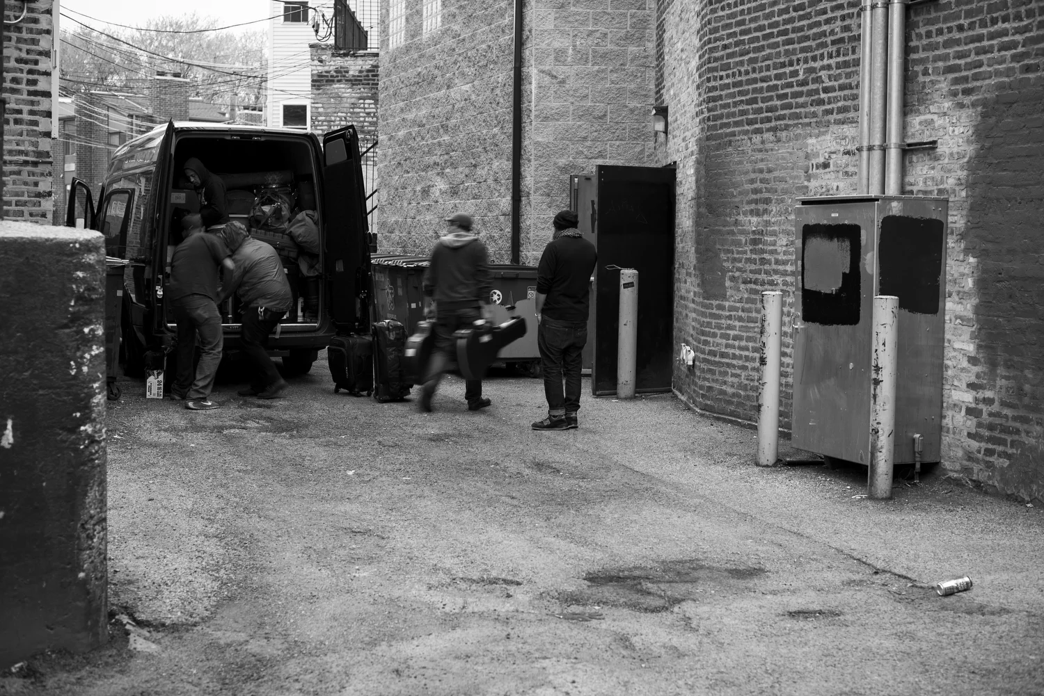 5PM—Loading the van is an art, a game of tetris with drums, guitars, amps, and luggage. Load it wrong and it won't fit, worse, something will break on the drive. Here, the band gets help unloading from venue employees.