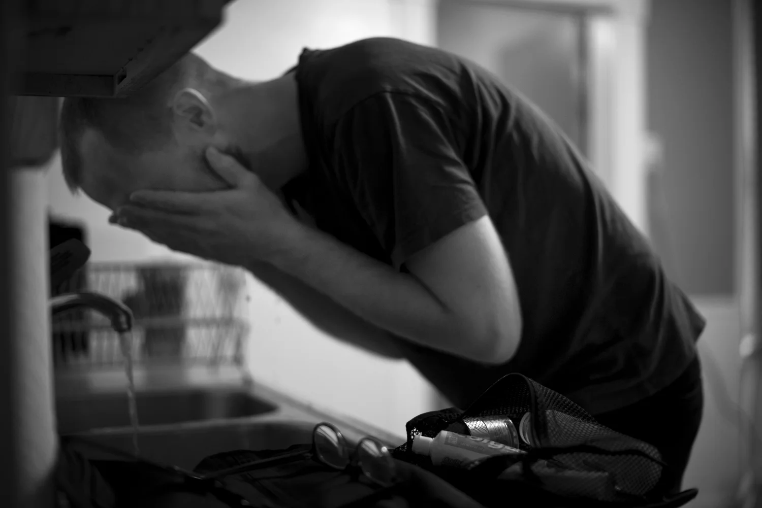 8AM— Adam splashes water on his face before another long drive. They got to sleep until around 2:30AM and have soundcheck at 3PM six hours away.