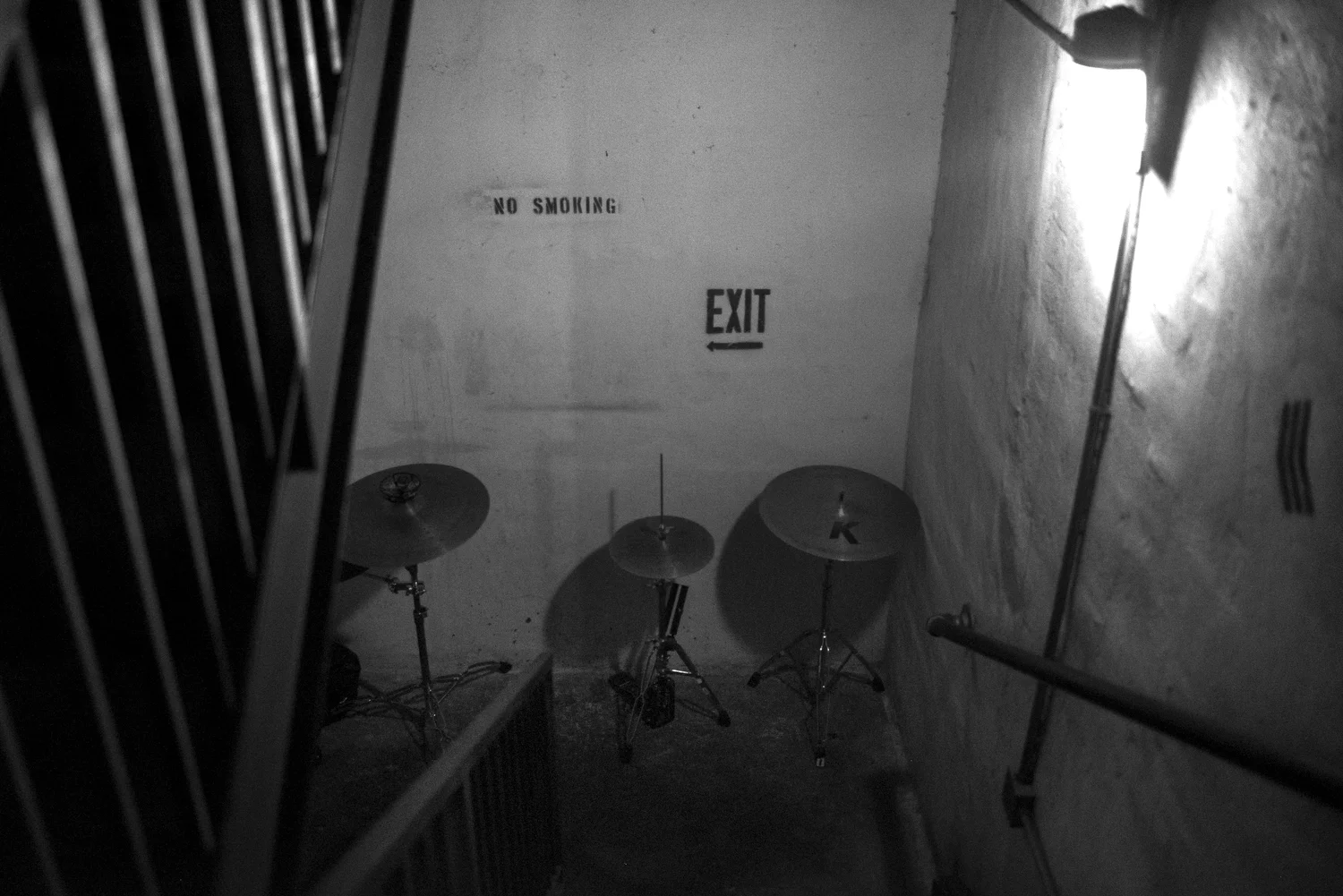 8PM—The opening band's cymbals are stashed in a backstage stairwell.
