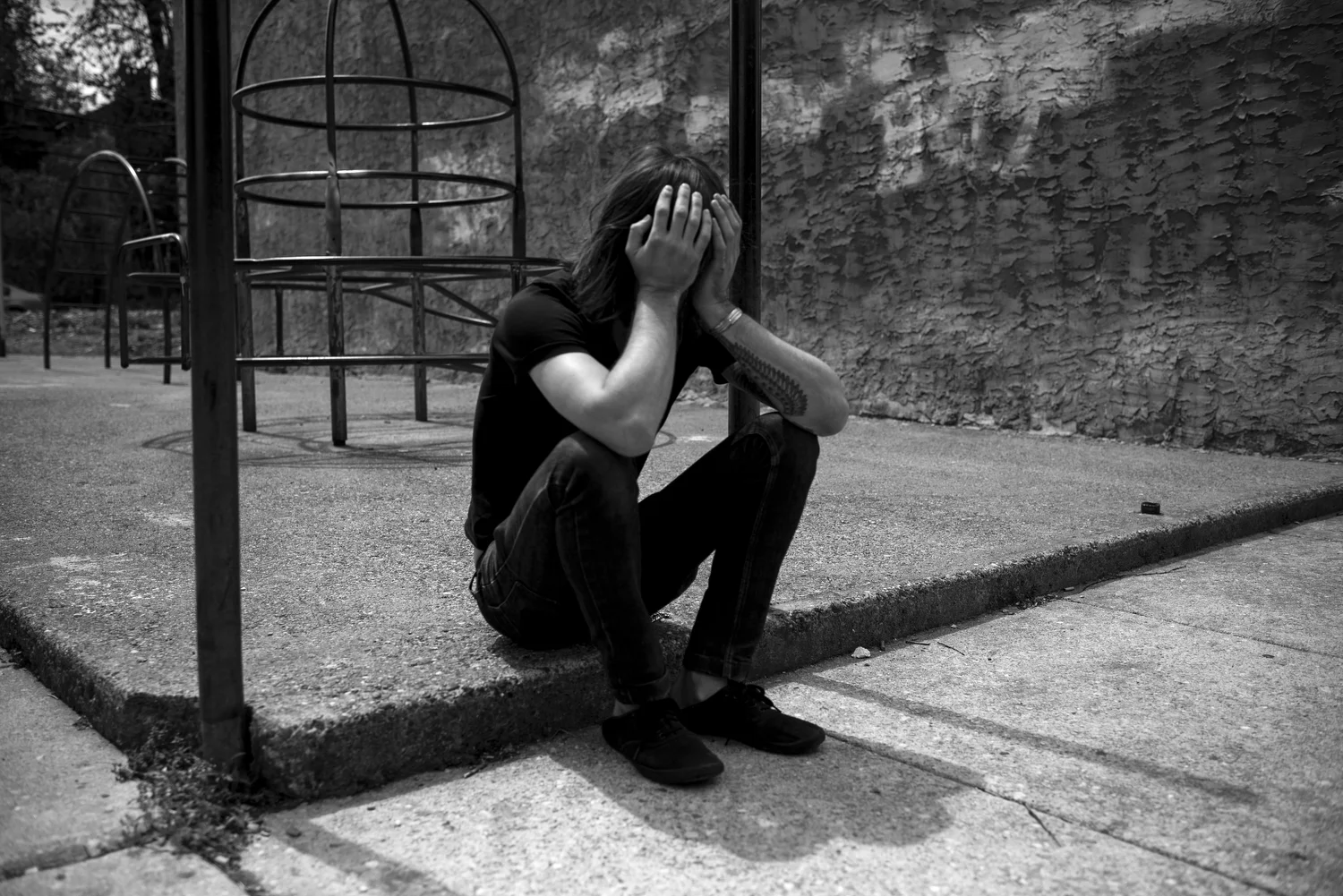 11 AM—Philadelphia. Tyson sits on a curb minutes after finding out the van had been robbed the night before. A lot of their gear is vintage and Tyson had put his drum set together over many years, carefully selecting each item. He would have to start over.