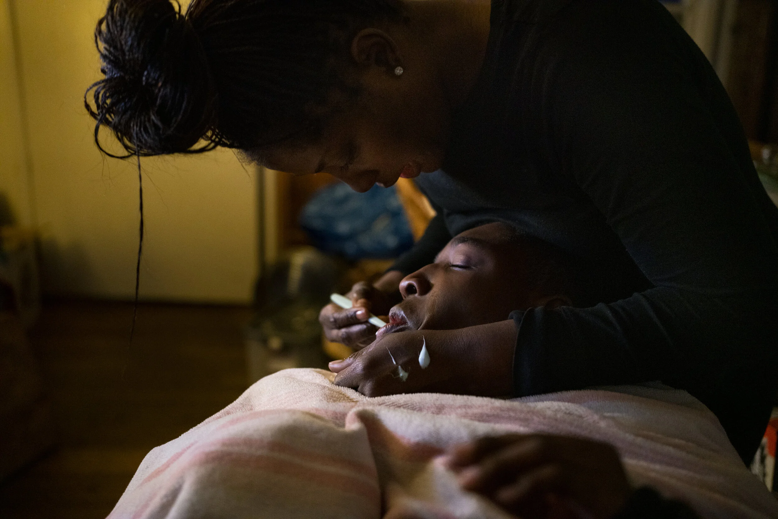 Serenity brushes Rashard Jr.’s teeth early in the morning before he goes to school.