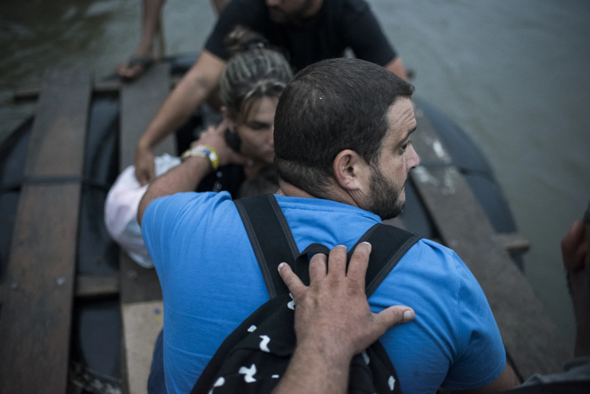 Sandra Maylin Santi and her family all hold onto each other while crossing the Suchiate River on a makeshift raft from Guatemala into Mexico.