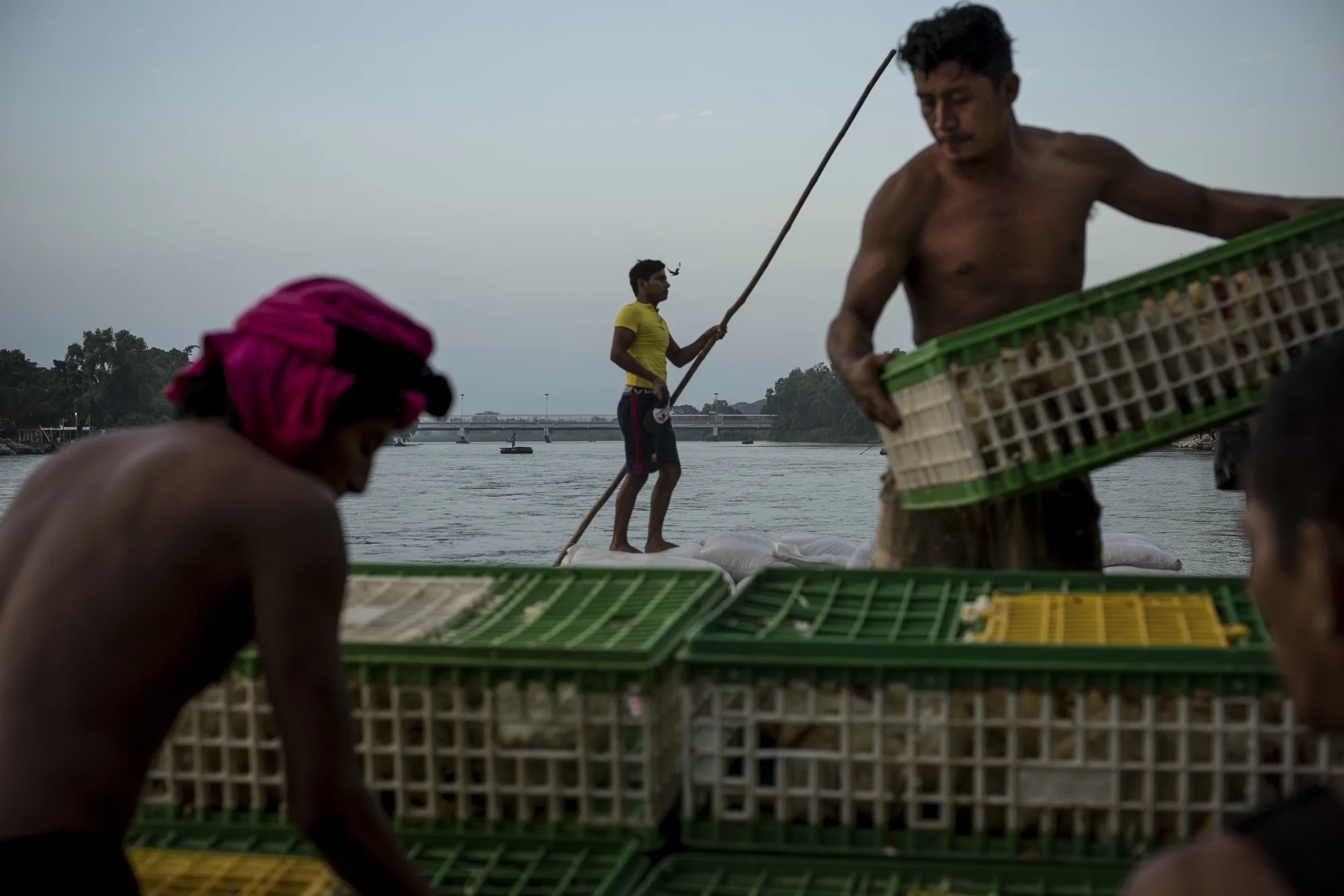 Merchants load chickens onto a raft for transport across the Suchiate River into Guatemala in the early morning hours of October 15, 2015.