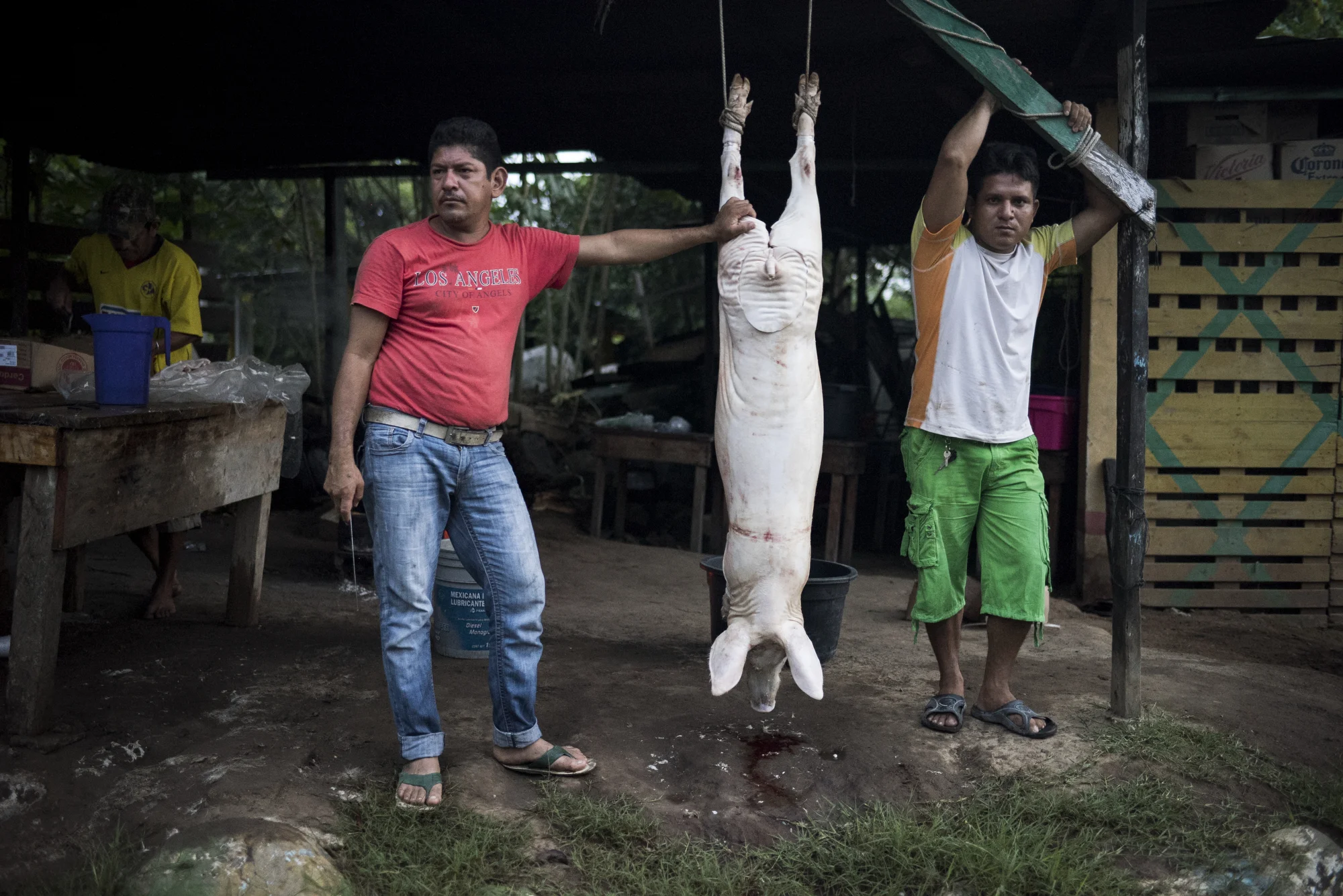 Men prepare a pig to be cooked on the Guatemalan side of the Suchiate River.